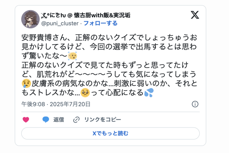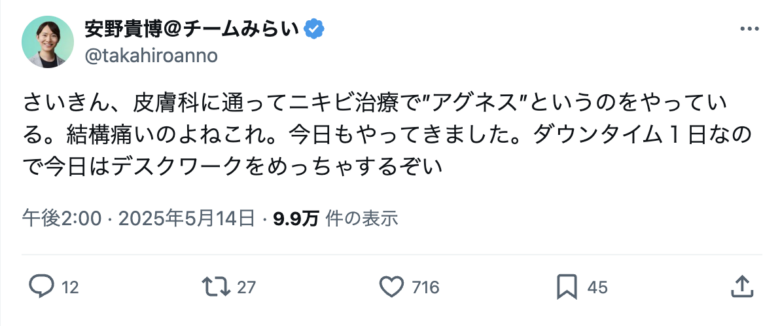 2025年5月のご本人のXにて、ニキビ治療をしていることを投稿されています。