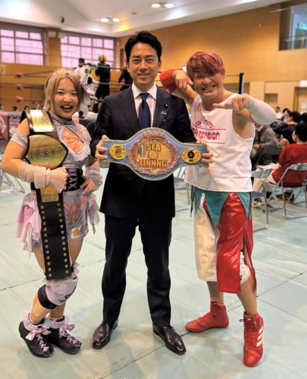 小泉進次郎の身長画像比較:レスラーの笹村あやめ(154センチ)と梶トマト(170センチ)
