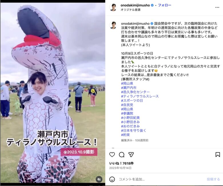 小野田紀美の活躍!着物姿・ティラノサウルスにも